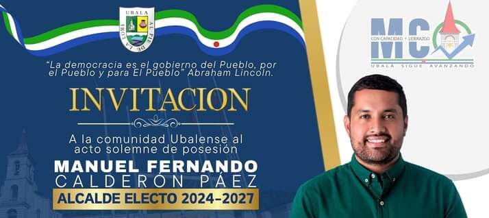 El exconcejal y hoy Alcalde Electo Manuel Calderón extiende una cordial invitación a toda la comunidad del municipio de Ubalá, para que lo acompañen el día 1 de enero en el acto solemne de su 𝙥𝙤𝙨𝙚𝙨𝙞ó𝙣 𝙘𝙤𝙢𝙤 𝙖𝙡𝙘𝙖𝙡𝙙𝙚 𝙙𝙚 𝙐𝙗𝙖𝙡á 𝙥𝙚𝙧í𝙤𝙙𝙤 𝙘𝙤𝙣𝙨𝙩𝙞𝙩𝙪𝙘𝙞𝙤𝙣𝙖𝙡 2024-2027.