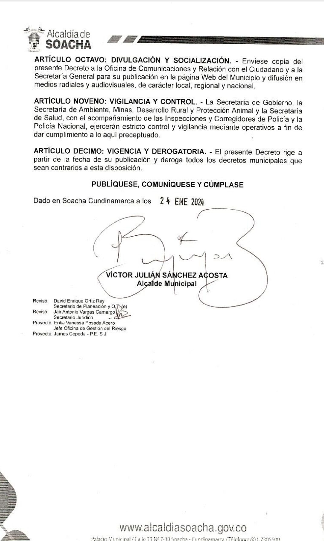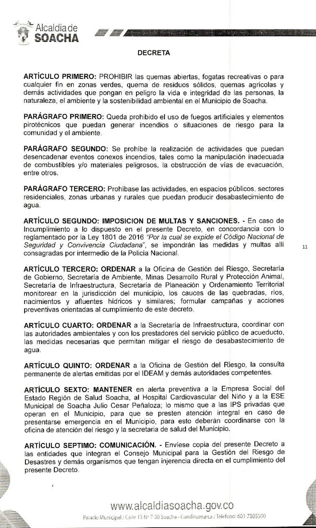 Por eso, desde la Administración de la ciudad, en cabeza de ‘Perico’, se expidió el Decreto 008 de 2024 «Por medio del cual, se prohíbe las actividades como quemas abiertas, quemas de juegos pirotécnicos, focos de incendios, y demás actividades conexas en el municipio de Soacha, a causa del Fenómeno del Niño».