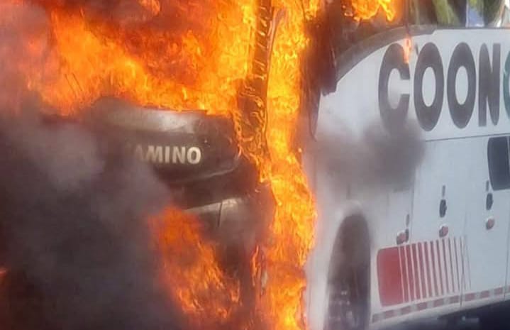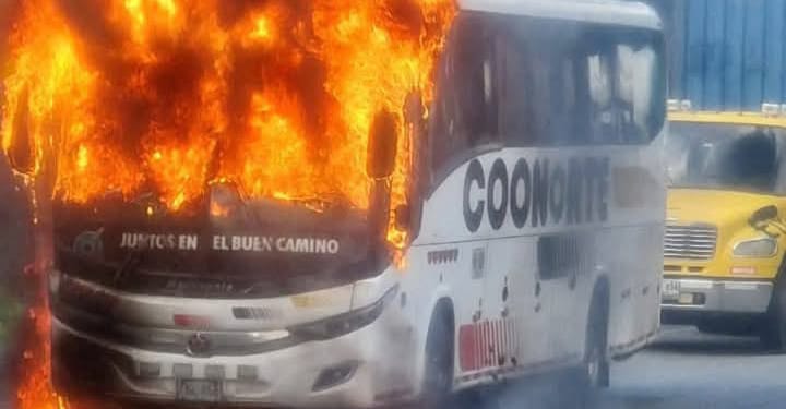 En la tarde del pasado martes, un bus de servicio público de la empresa Coonorte que cubre la ruta entre Medellín y la Costa Atlántica fue interceptado por presuntos miembros del ELN que bajaron a los pasajeros del bus y acto seguido lo prendieron en llamas.