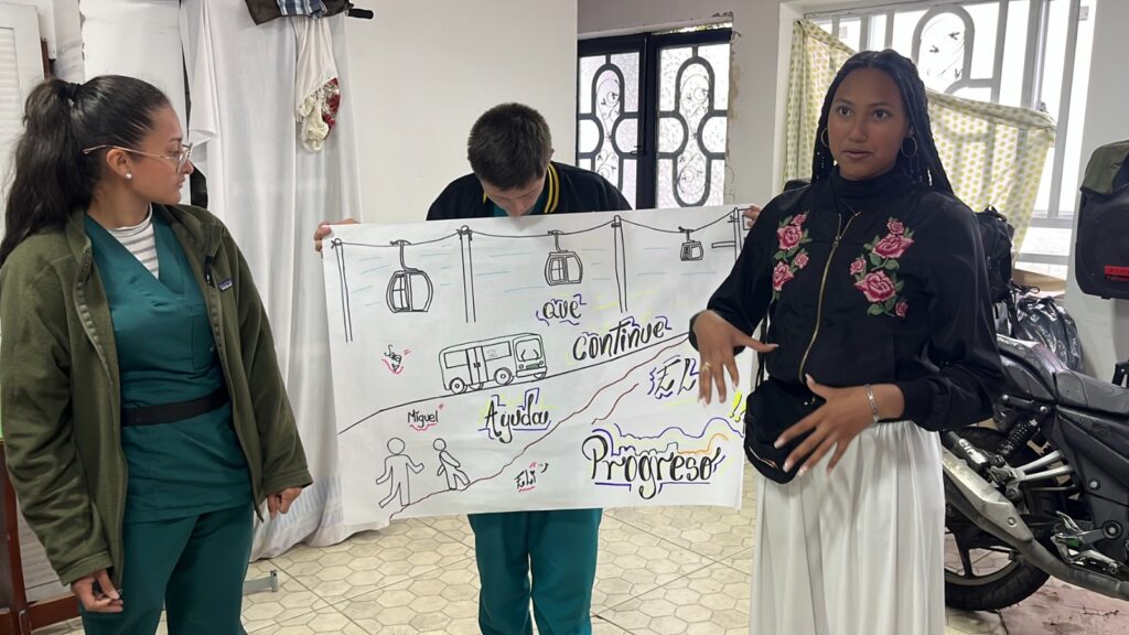 La jornada del mes de abril se desarrolló en tres momentos clave. En primer lugar, se realizó una introducción dinámica sobre los deberes ciudadanos a través de juegos como “bolos de los deberes y normas” y “adivina qué norma es”, con el fin de facilitar la comprensión de conceptos clave en una forma lúdica y cercana. Luego, se abrió un espacio de diálogo e intercambio de saberes donde los jóvenes compartieron experiencias y reflexionaron sobre cómo el transporte público ha contribuido a mejorar la calidad de vida en sus comunidades. Finalmente, a través de una actividad artística, los participantes representaron su visión del territorio en tres tiempos: cómo era su comunidad antes, cómo es ahora y cómo esperan que sea en el futuro.