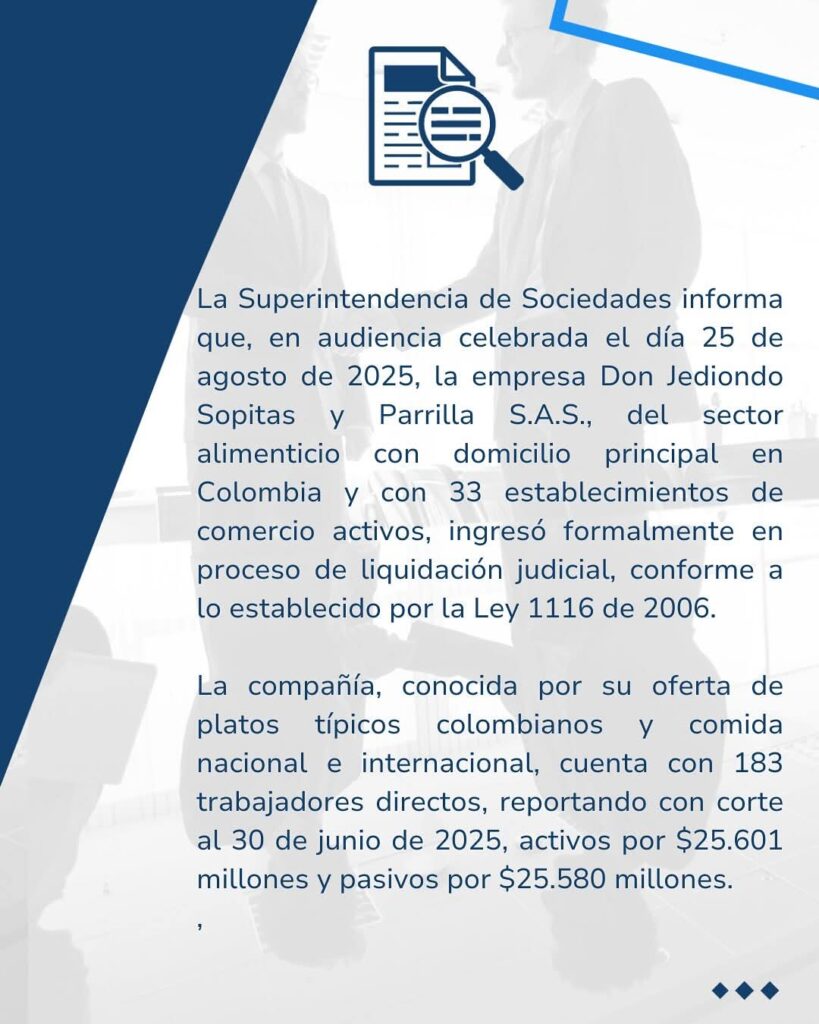La Superintendencia de Sociedades informa que, en audiencia celebrada el día 25 de agosto de 2025, la empresa Don Jediondo Sopitas y Parrilla S.A.S., del sector alimenticio con domicilio principal en Colombia y con 33 establecimientos de comercio activos, ingresó formalmente en proceso de liquidación judicial, conforme a lo establecido por la Ley 1116 de 2006.