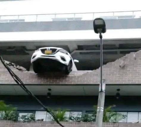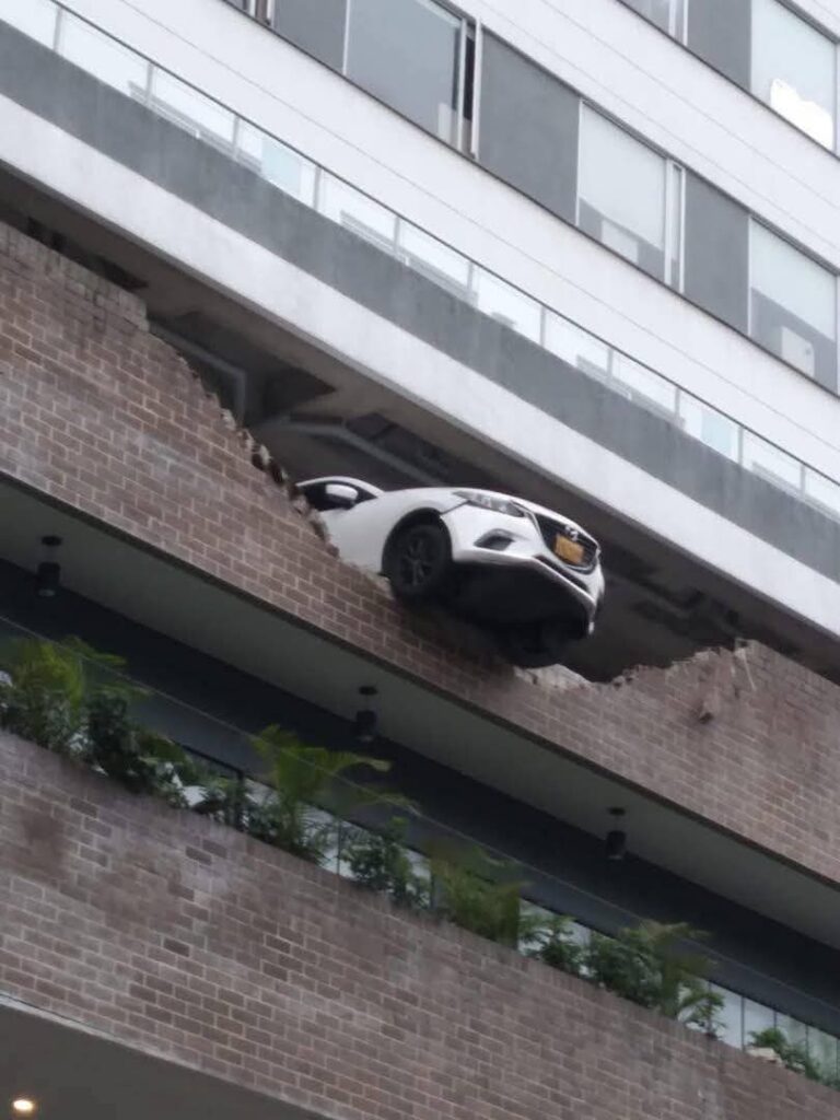 Aún se desconocen los motivos del porqué el o la conductora del carro terminó impactando el muro de ladrillo y quedó al borde del edificio. No se sabe si fue por la mala ejecución de un cambio y, en vez de reversar, se fue de frente hacia el concreto.